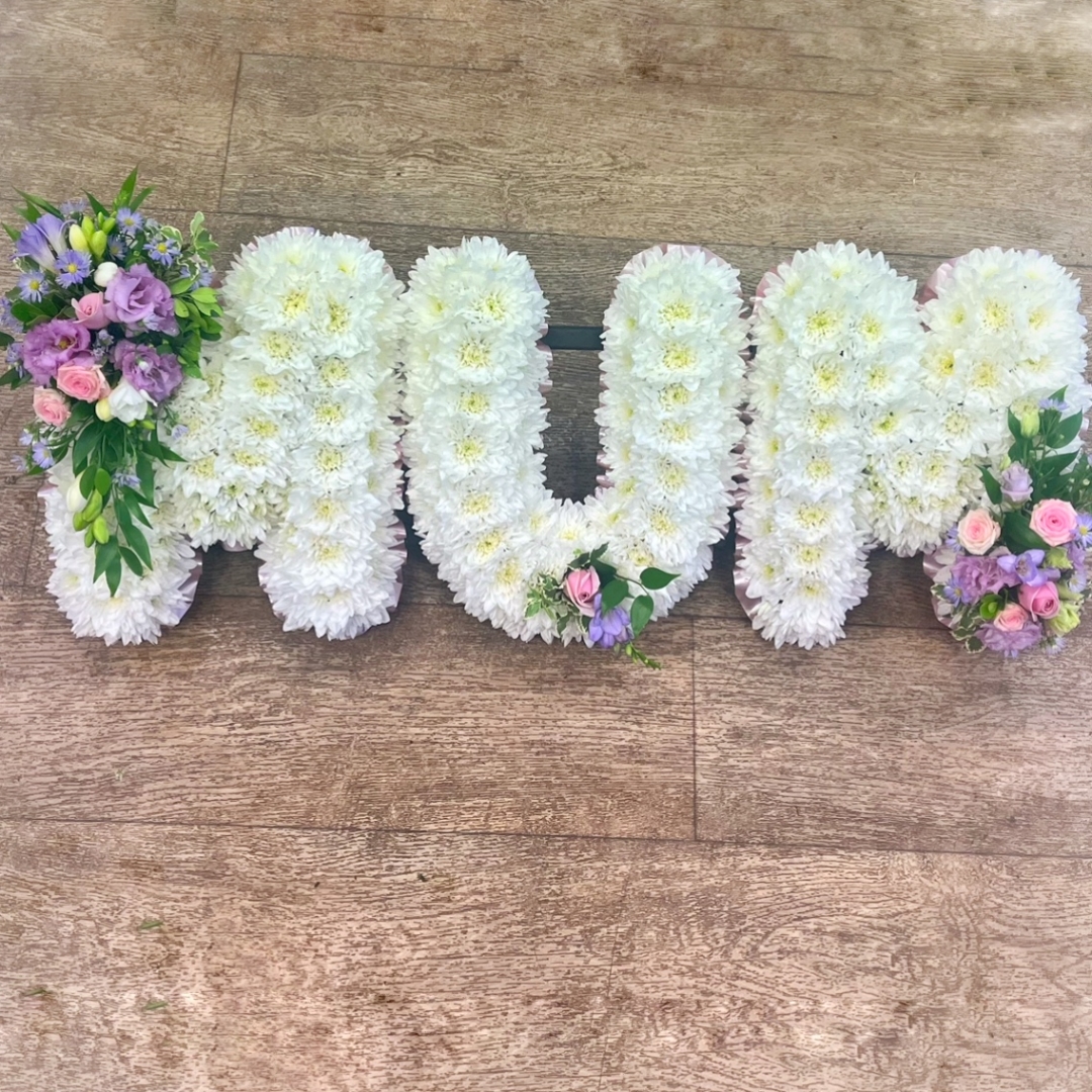'MUM' This floral tribute is formed using 12'' high letters that are ribbon edged. The flowers are massed to create a white 'base', then accented with clusters of pink and lilac flowers.